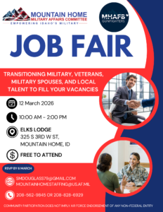 The Mountain Home Military Affairs Committee, in partnership with Mountain Home Air Force Base, is hosting a job fair connecting service members, veterans, military spouses, and the community with local and regional employers.